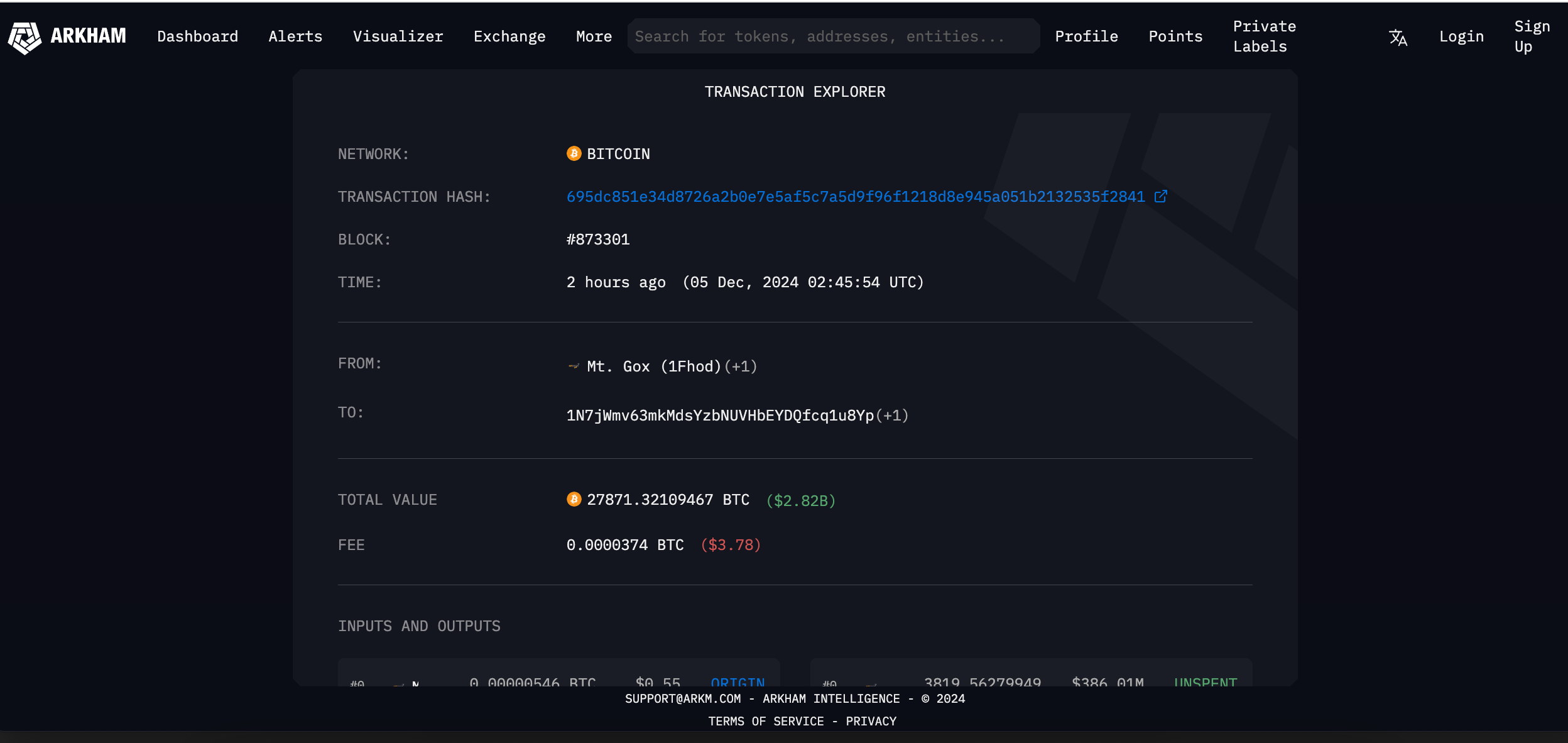 The address labelled as Mt. Gox (1FHOD) by analytics firm Arkham Intelligence moved 27,871 BTC worth $2.8 billion to another address: 1N7jWmv63mkMdsYzbNUVHbEYDQfcq1u8Yp. The exchange still holds 39,878 BTC worth over $4 billion at press time.