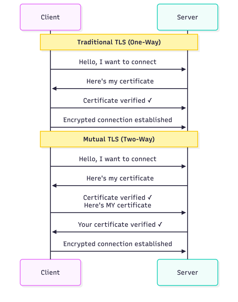 Real-world analogy: Traditional TLS is like calling a company – they answer “Hello, this is Acme Corporation” and you trust them. mTLS is like calling a secure government facility where they first verify who they are, then ask “What’s your employee ID number?” before continuing the conversation.