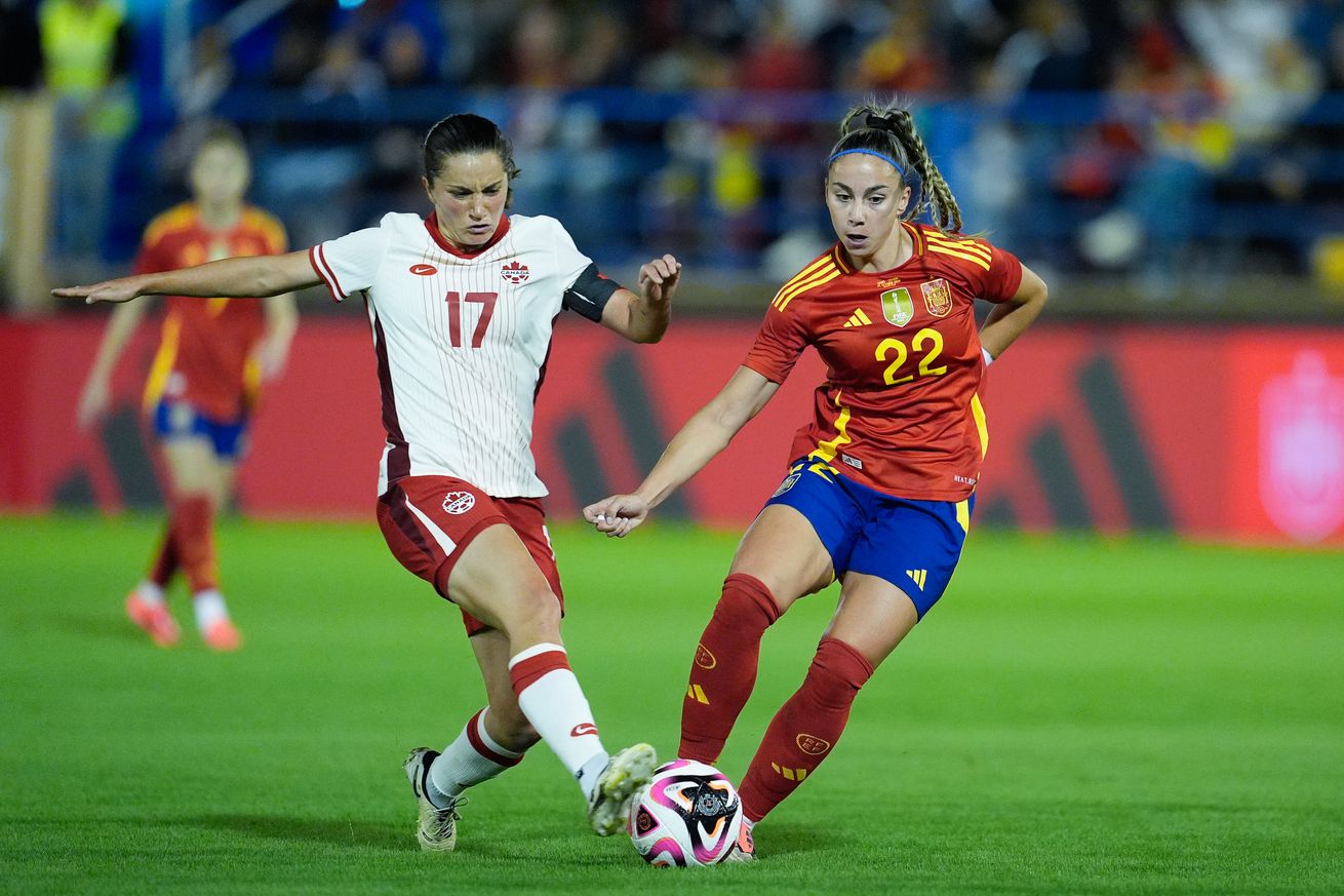 BADAJOZ, SPAIN - OCTOBER 25: Jessie Fleming of Canada and Athenea del Castillo of Spain in action during the International Friendly match played between Spain and Canada at Francisco de la Hera stadium on October 25, 2024, in Badajoz, Spain.