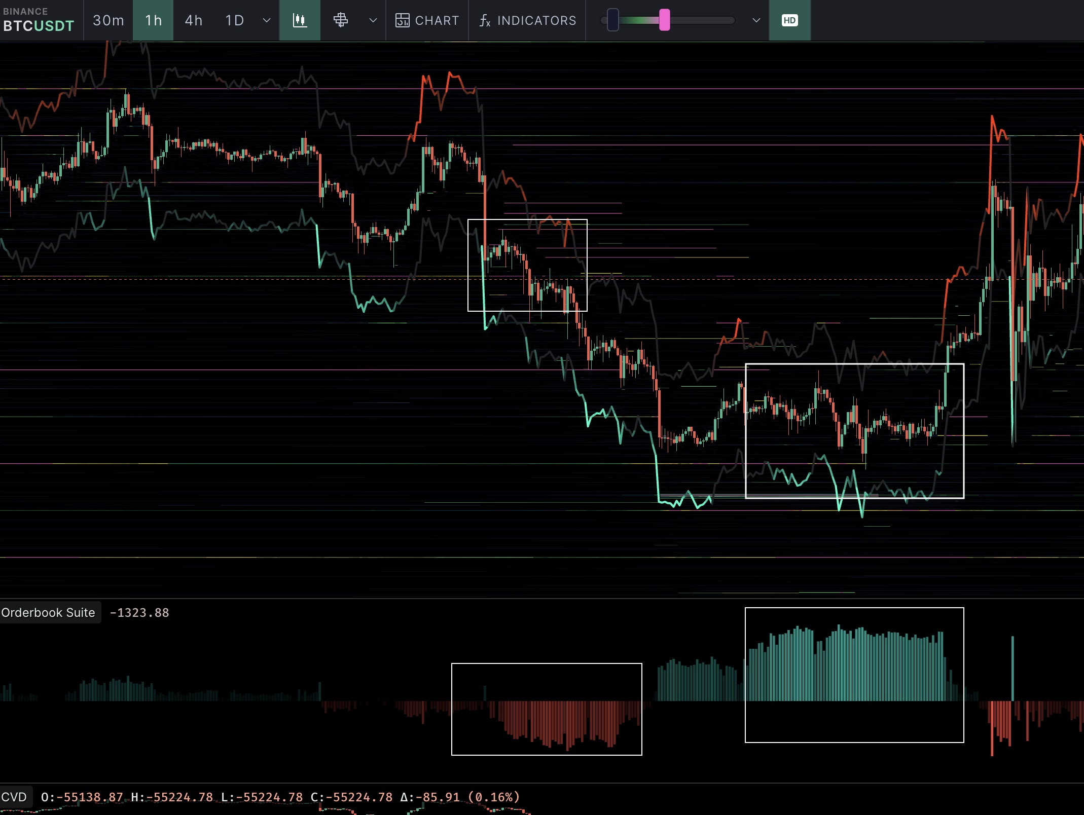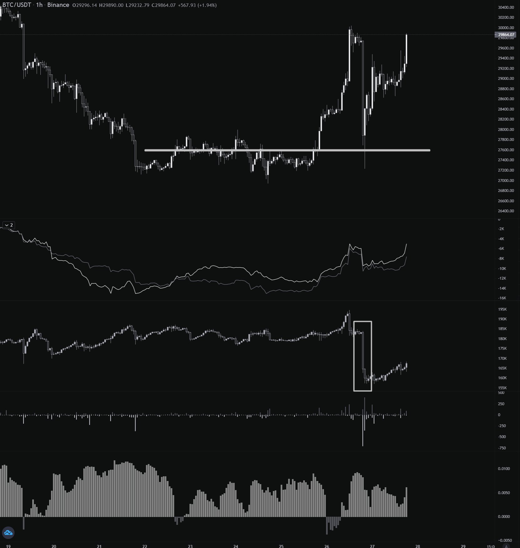Below you can see BTCUSDT on Binance and how price action reacted when the order book got significantly skewed to one side.