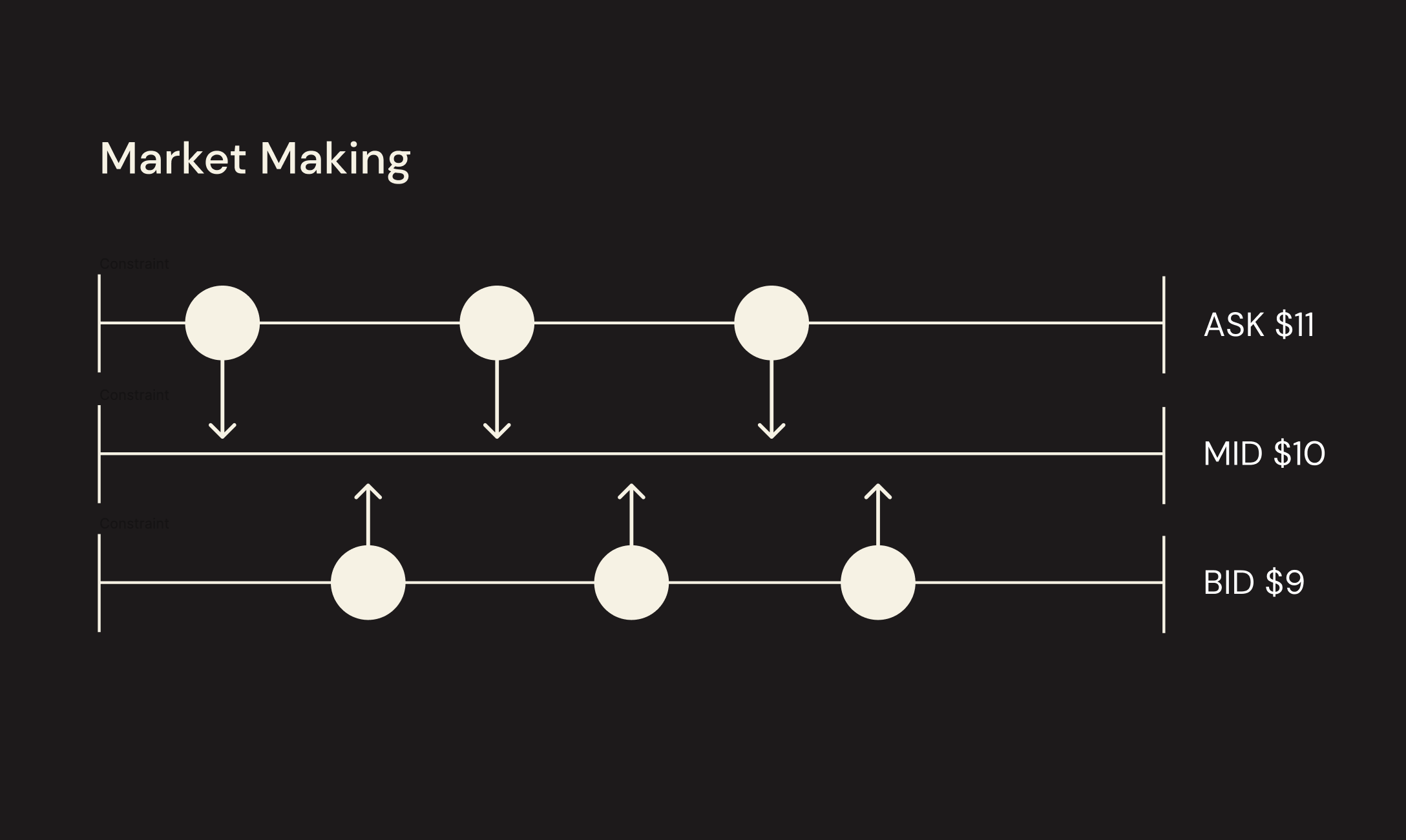 Market makers quote both bid and offer at the same time and their main goal is to not have directional exposure to the market, they don’t make money by trying to capture where markets are going to go next, but by capturing the spread between bid and the ask.