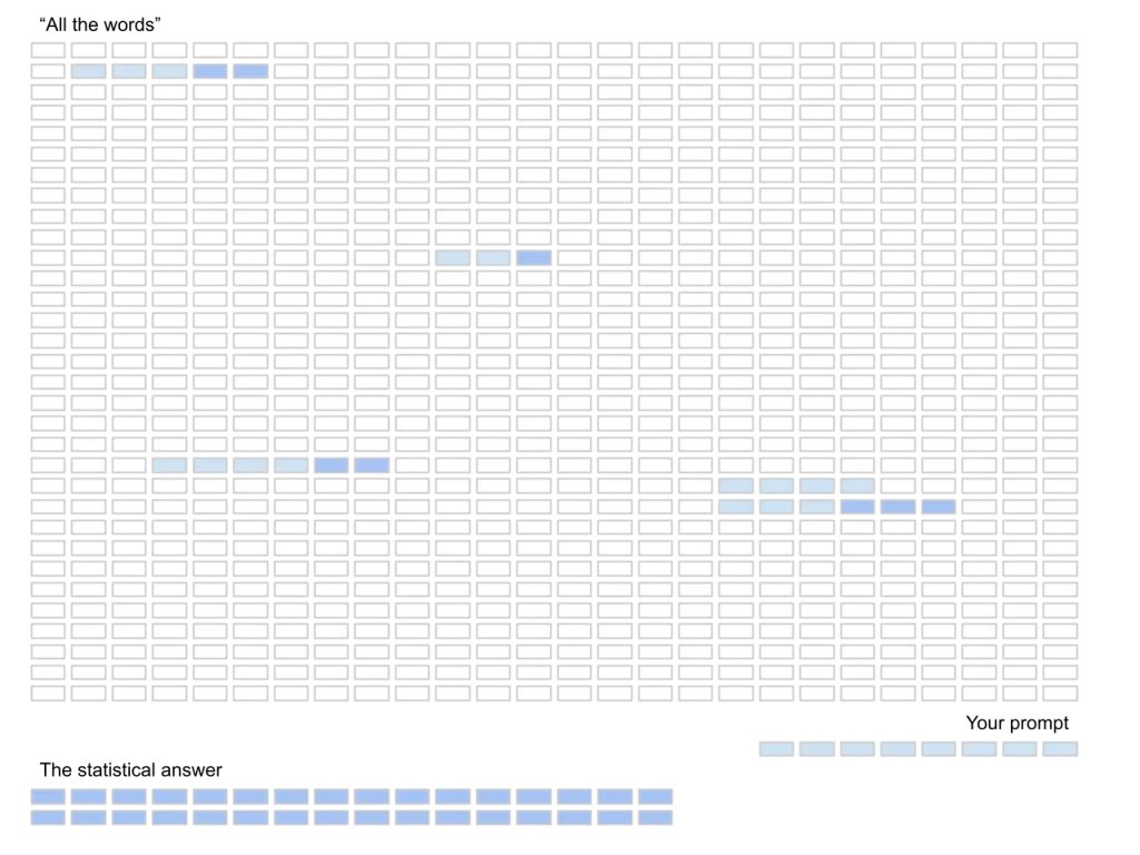 Then they calculate the incredibly vast, though not infinite, likelihood of words appearing in a sequence. It may be difficult to grasp, but apparently, we’re not completely ‘creative’ when structuring sentences and ideas. There is an order for how content appears in the huge corpus of human written knowledge. What happens next is when you ask them a question (give them a ‘prompt’) – they find the most likely (statistically speaking) sequence of words that will satisfy your prompt. They did not “understand” your question – they only calculated what would most likely “come next” based on all the words.