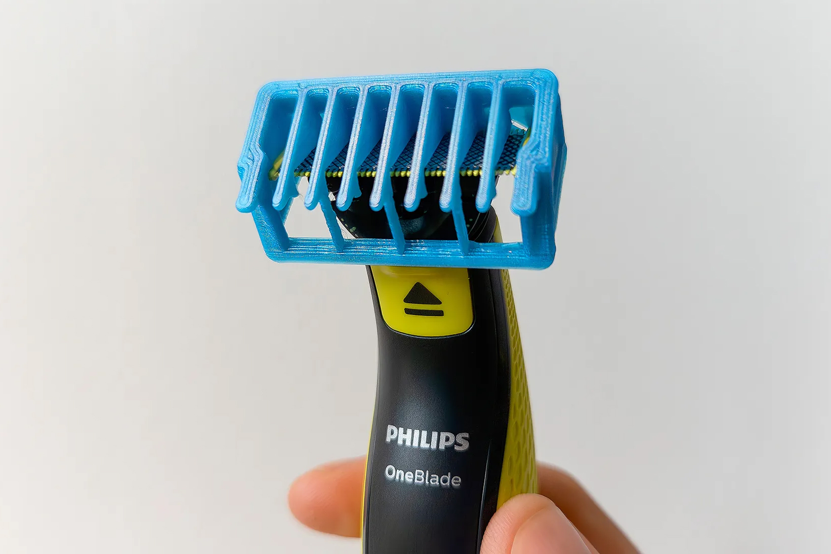 A Philips OneBlade trimmer with a 3D-printed comb attached.