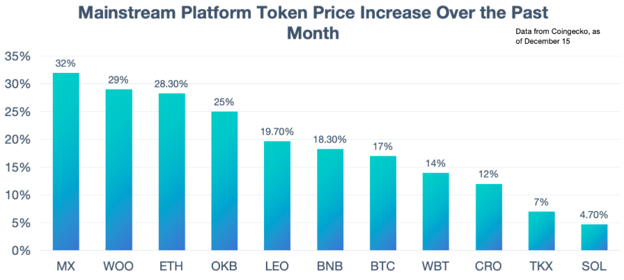 Besides evaluating gains, it is equally important to assess the resilience of platform tokens during market corrections. On December 9, the cryptocurrency market saw a significant correction, with ETH experiencing a peak intraday decline of over 12%. This was accompanied by a sharp sell-off in altcoins, with some tokens losing up to 50% of their value within a single day. During this period, platform tokens showcased their robust defensive qualities. MX, for instance, recorded a maximum intraday decline of 10%, but swiftly recovered to close the day down by just 6%, outperforming both BNB (down 8.2%) and ETH (down 7.3%).