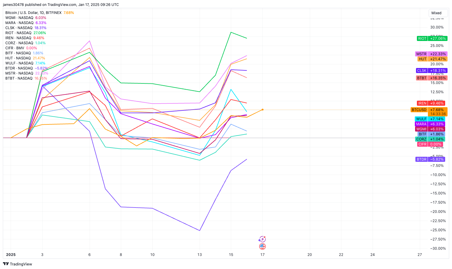 This year, though, the miners that HODL bitcoin have strongly benefited, with RIOT, HUT and CLSK all outperforming bitcoin. Only Bitdeer (BTDR) has generated negative returns, after seeing a strong performance in 2024.