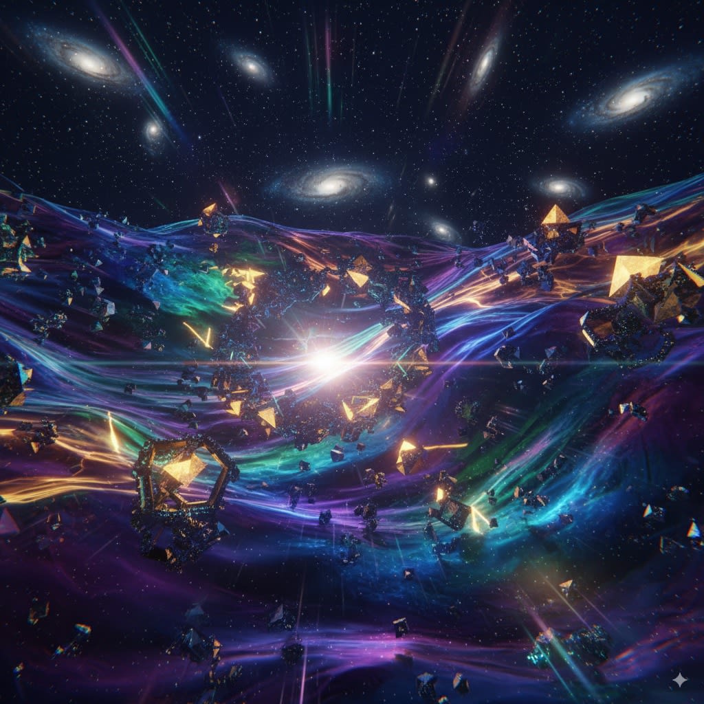 - Quantum superposition enables parallel calculation of infinite field configuration possibilities.