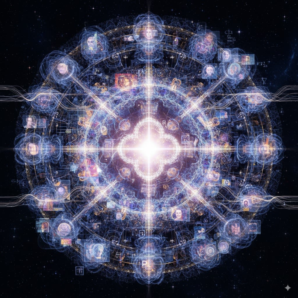 - Quantum superposition allows simultaneous existence as multiple personality aspects.