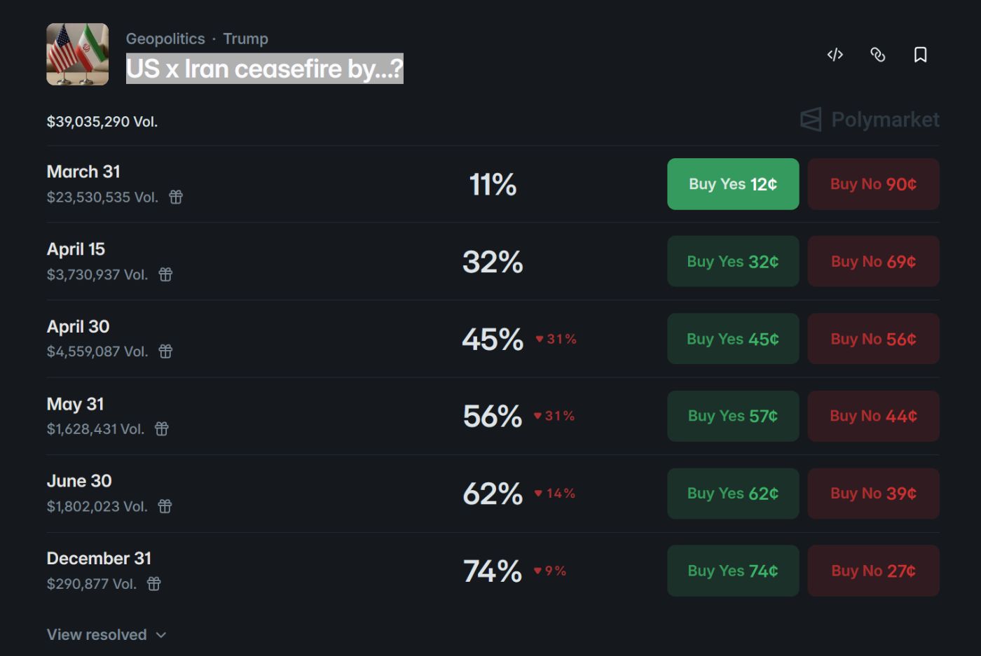 U.S. and Iran are trading bombs, threats, and.. memes? So Polymarket is doing what it does best; letting users decide whether both sides will reach a ceasefire and by when.