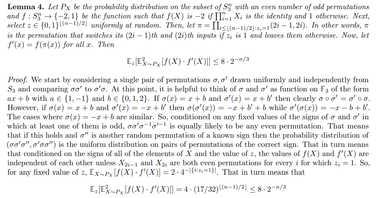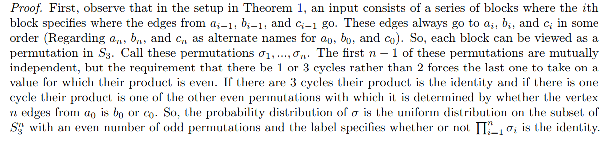 Theorem 2. Let G be a directed graph which consists of a cycle of length 3n with probability 2/3 and 3 cycles of length n otherwise. Next, if there are 3 cycles pick one vertex from each and if there is one cycle pick three vertices that are each n edges apart. Then, label uniformly at random these vertices with a0, b0, c0. Next, number every other vertex by the distance from one of these three to it, and for each i, label uniformly at random the vertices at distance i by ai, bi, and ci and store in X the edges between ai − 1, bi − 1, ci − 1 and ai, bi, ci; i.e.