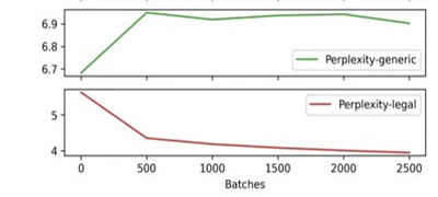 Thomson Reuters used a measure called perplexity. It quantifies how well the model predicts a sample of text. In essence, perplexity measures the confidence a model has in its predictions. Lower perplexity indicates that the model is more certain about its predictions. From the following graph, you can see that as Thomson Reuters increased their batches of training, legal perplexity decreased while general perplexity increased somewhat, before quickly leveling off.