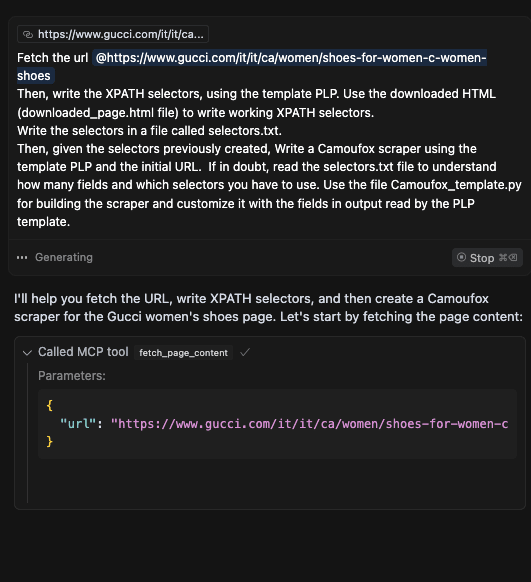 Cursor opens a Camoufox tab, browses to the URL I passed, saves the HTML in a file, reads it, and then generates XPATH selectors and saves them in another file. I opted to save the results of each step inside a file so that the following steps could read them and eventually chunk them automatically rather than passing their content in the context window, which could be too small.