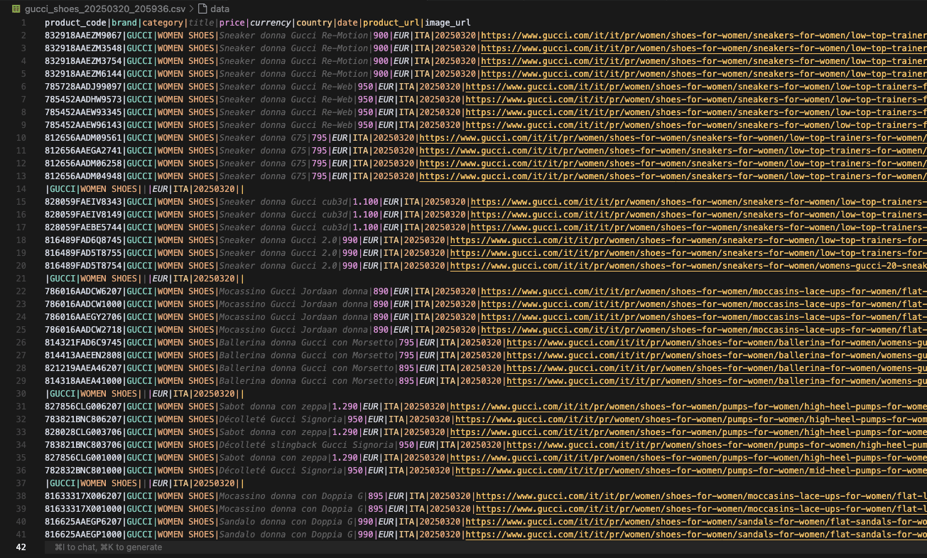 “Fetch the URL @https://www.gucci.com/it/it/ca/women/shoes-for-women-c-women-shoes n Then, write the XPath selectors using the template PLP. Use the downloaded HTML (downloadedpage.html file) to write working XPATH selectors. n Write the selectors in a file called selectors.txt. n Then, given the selectors previously created, Write a Camoufox scraper using the template PLP and the initial URL. If in doubt, read the selectors.txt file to understand how many fields and which selectors you have to use. Use the file Camoufoxtemplate.py for building the scraper and customize it with the fields in output read by the PLP template.”
