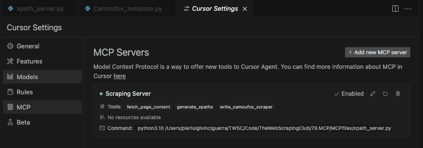 One of the great things about Cursor (an AI-powered IDE) is its built-in support for MCP servers as extensions of the AI’s capabilities. We will integrate our newly created MCP server into Cursor so that the AI assistant can use it to automate web scraping tasks (like generating XPath selectors for us).