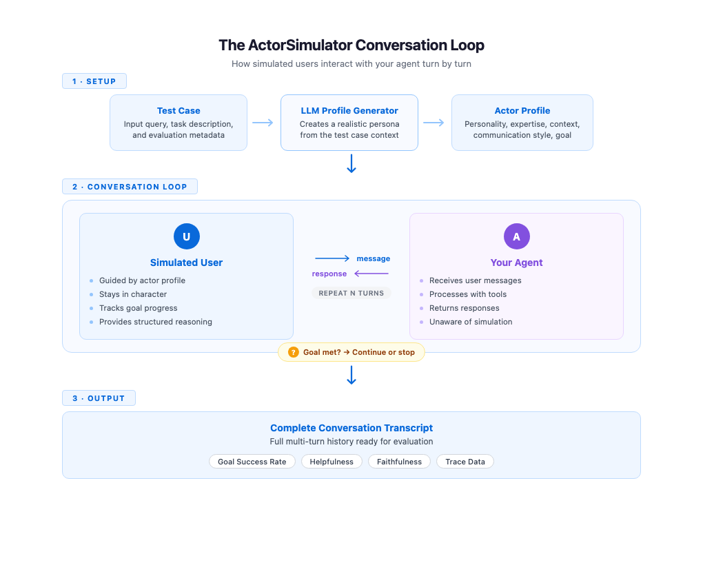 Goal tracking runs alongside the conversation. ActorSimulator includes a built-in goal completion assessment tool that the simulated user can invoke to evaluate whether their original objective has been met. When the goal is satisfied or the simulated user determines that the agent cannot complete their request, the simulator emits a stop signal and the conversation ends. If the maximum turn count is reached before the goal is met, the conversation also stops. This gives you a signal that the agent might not be resolving user needs efficiently. This mechanism makes sure conversations have a natural endpoint rather than running indefinitely or cutting off arbitrarily.