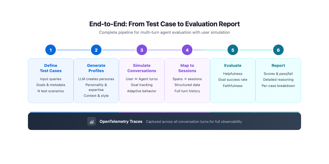 This approach captures complete traces of your agent’s behavior across conversation turns. The spans include tool calls, model invocations, and timing information for every turn in the simulated conversation. By mapping these spans into a structured session, you make the full multi-turn interaction available to evaluators like GoalSuccessRateEvaluator and HelpfulnessEvaluator, which can then assess the conversation as a whole, rather than isolated turns.