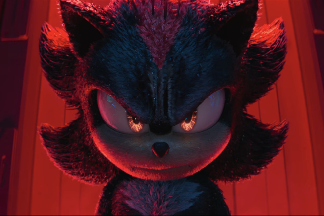 Screenshot from Sonic The Hedgehog 3 featuring a closeup of Shadow the Hedgehog.