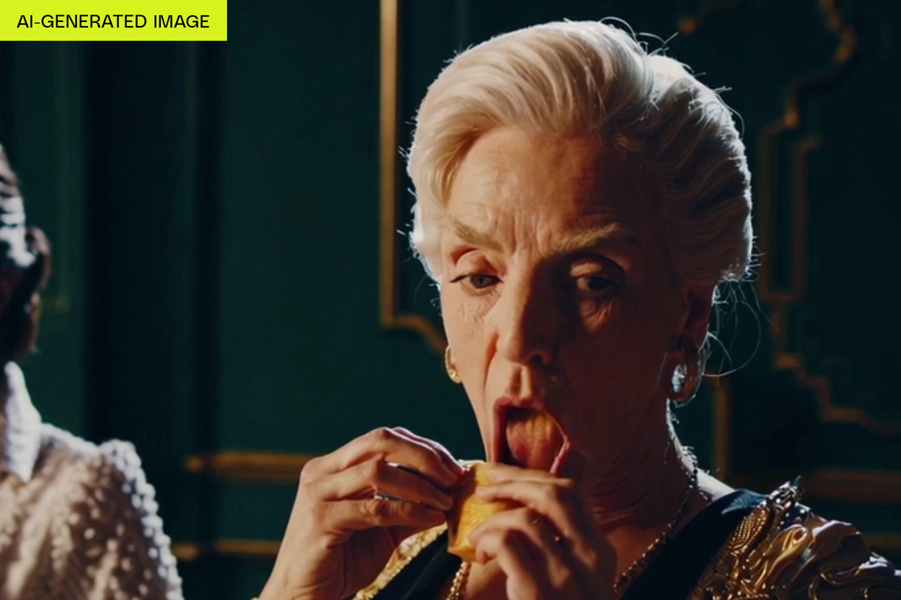 Prompt: “King Charles III UK eating a Greggs sausage roll on the throne.” There’s a lot wrong with these results… | Image: OpenAI / The Verge