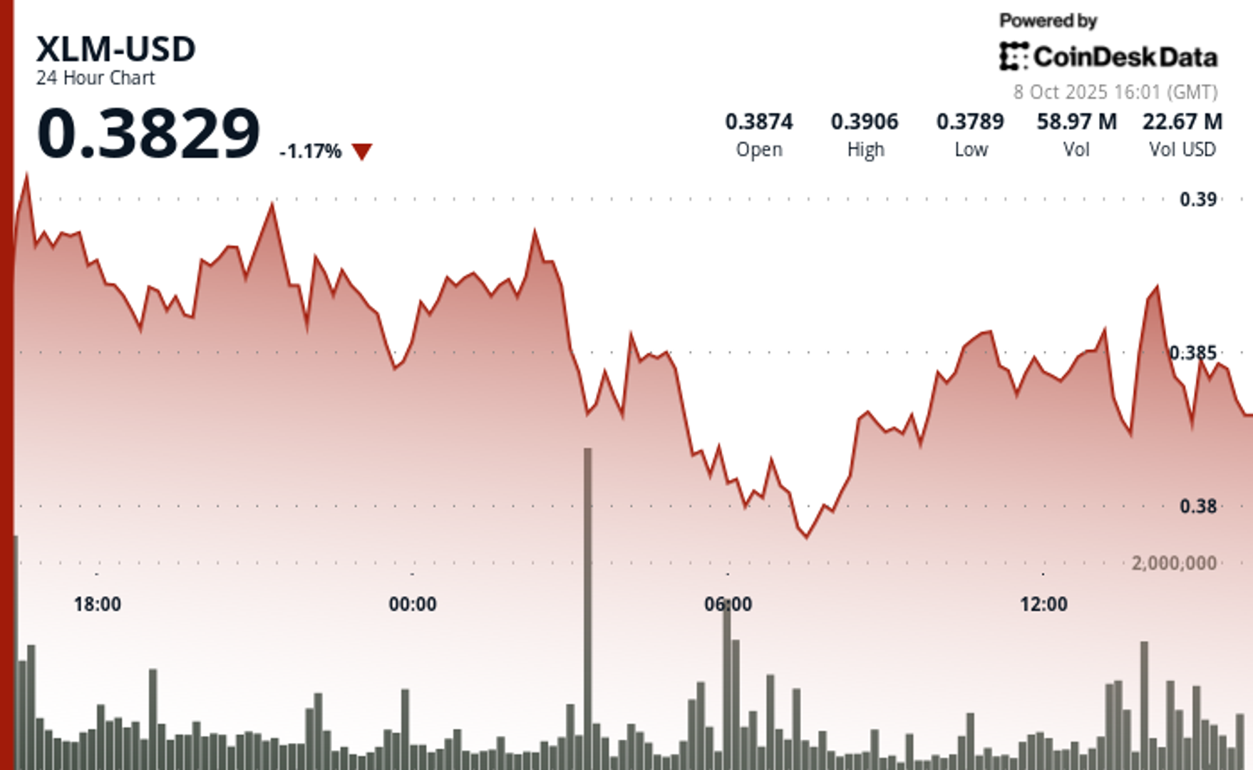 Stellar’s native token XLM experienced heightened volatility over the past 24 hours, fluctuating between $0.38 and $0.39 — a 3% range — before closing near session highs. After dipping to $0.38 early on Oct. 8, the asset mounted a swift recovery, regaining ground above $0.39 by the end of the period, suggesting robust buying activity at lower levels.