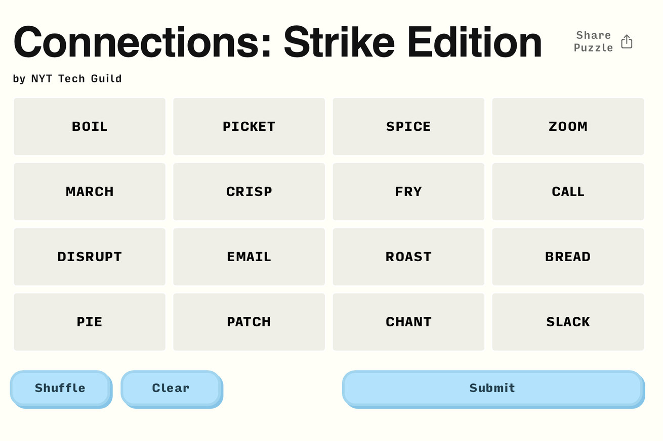 The “Strike Edition” puzzle was made on a website that lets people create their own Connections. The workers, part of the New York Times Tech Guild, specifically asked NYT readers not to play NYT games when the strike began on Monday, so the custom puzzle offers a way to play while still respecting the Guild’s wishes.
