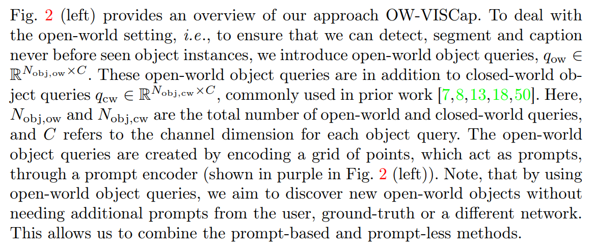 We provide an overview of OW-VISCap to process each clip in Sec. 3.1. We then discuss our contributions: (a) introduction of open-world object queries in Sec. 3.2, (b) use of masked attention for object-centric captioning in Sec. 3.3, and (c) use of inter-query contrastive loss to ensure that the object qeries are different from each other in Sec. 3.4. In Sec. 3.5, we discuss the final training objective.