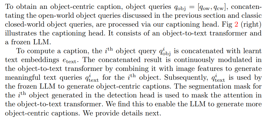 Both open- and closed-world object queries are processed by our specifically designed captioning head which yields an object-centric caption, a classification head which yields a category label, and a detection head which yields either a segmentation mask or a bounding-box.