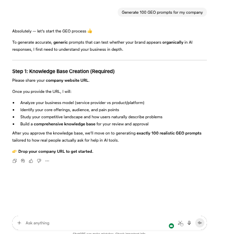 Zen Media launched GEO GPT™ to make that measurable. It runs inside ChatGPT, generates a 100-prompt test set for a brand’s category, and checks whether models like Claude and GPT-5 include the brand when users describe the problems it solves. No installation is required, and it takes only minutes to start.
