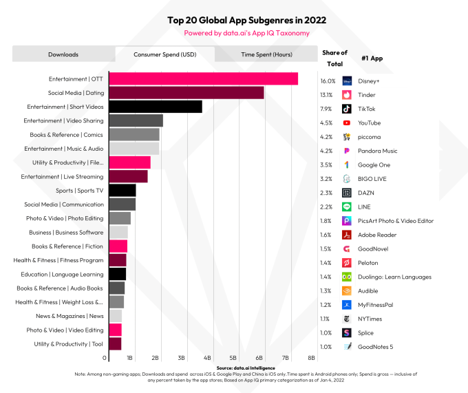 As it turned out, non-game apps have proven to be more resilient in a down economy, data.ai found, possibly because consumers view apps as more essential than games. In 2022, spending on games dropped 5% to $110 billion, while spending on non-game apps increased 6% to $58 billion — the latter, driven by streaming subscriptions, dating apps, and short-form video apps.