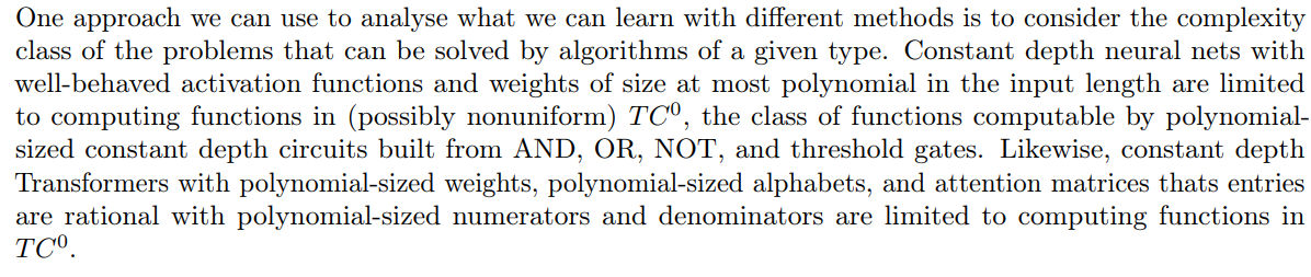 On the other hand, with appropriate setup, deep neural nets, recurrent neural nets, and Transformers with scratchpads are Turing complete. Furthermore, they can simulate a Turing machine using resources polynomial in the number of steps the Turing machine runs for and the input length. So, with appropriate parameters these can efficiently solve any problem that it is possible to solve efficiently. A little more precisely, given a neural net where the input bits are 0 or 1, it is fairly easy to set a neuron to compute an AND, OR, or NOT of one or more previous values, so any circuit can be converted into a neural net of at most equal size. Any efficient computation can be performed by a polynomial-sized circuit, so it can also be performed by a polynomial-sized deep neural net. Also, given a Turing machine in a state where all entries in its tape that are more than n steps away from the head or heads are in their initial state, there is a circuit of depth O(1) and size O(n) that computes the next state of the Turing machine. That means that running a Turing machine for T steps on an input of length n can be simulated by a recurrent neural net of size O(T + n) and T recurrences. Conversely, given a neural net with a reasonable activation function and sub-exponential edge weights, one can estimate the output of each neuron to within an exponentially small error in time polynomial in the size of the net.