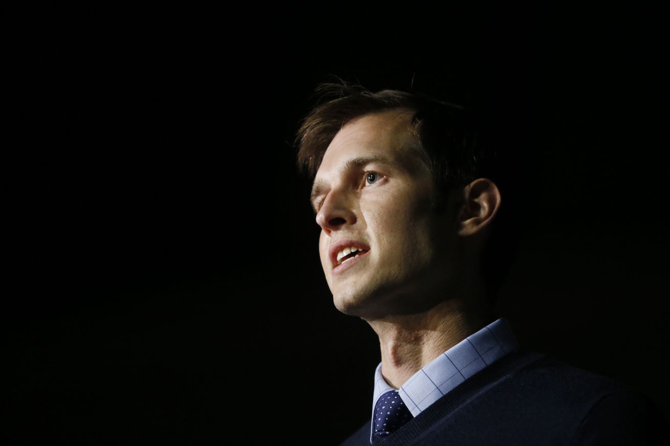 Representative Jake Auchincloss speaks to reporters in 2020. | Photo by Jessica Rinaldi/The Boston Globe via Getty Images