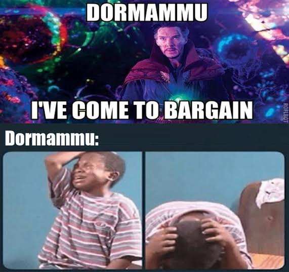 For those who don’t understand the the reference, dormamu is a world eating villain from the Avengers series in the first doctor strange movie. After consuming many planets, dormamu sets its murderous eyes on earth to swallow it and at first sight seems rather unstoppable. However, Dr. Strange stops the monster by with a simple magic trick of trapping it in a time loop. A rather ridiculous ending if you ask me.