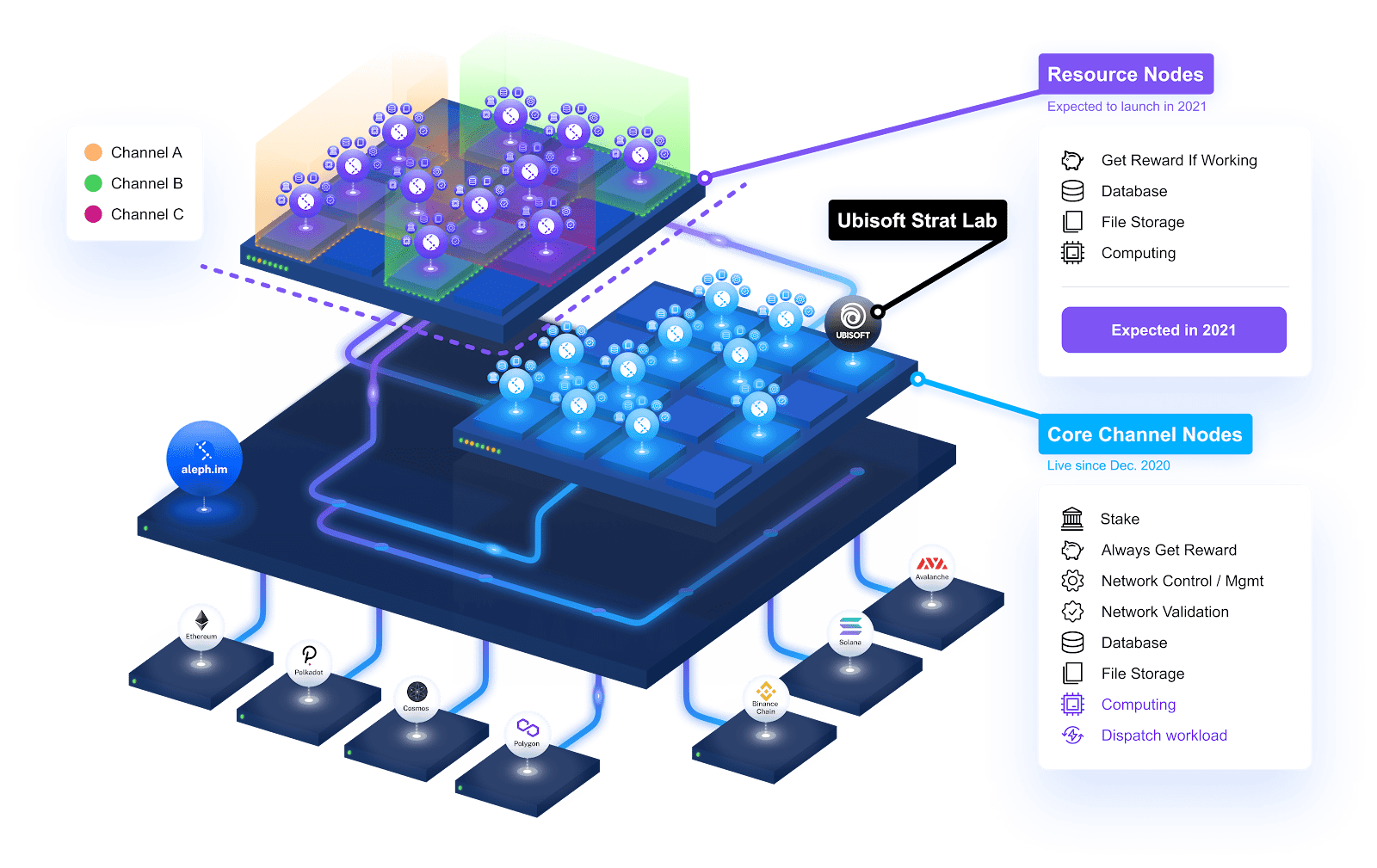 The Aleph peer-to-peer network comprises Compute Resource Nodes or CRNs and Core Channel Nodes, or CCNs.
