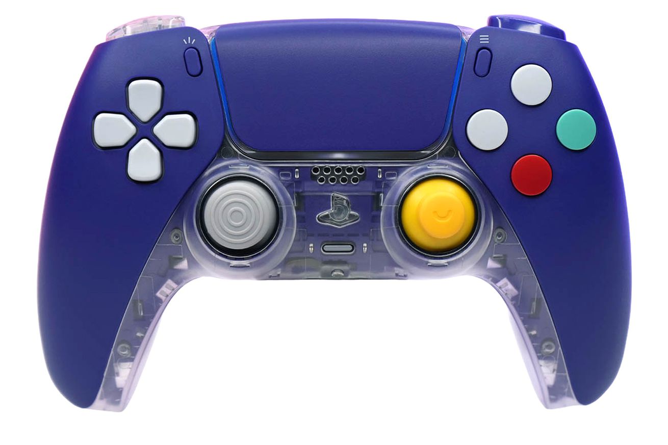 Killscreen’s customized controllers are all based on a standard DualSense Wireless Controller, so while the CubeSense pairs a matte purple shell on the front with a transparent one on the back, its red, green, and light gray face buttons don’t match the unusual button layout Nintendo used for the GameCube’s gamepads.