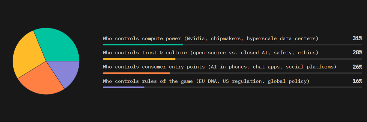 31% said it’s all about compute power — whoever controls the chips and data centers calls the shots.