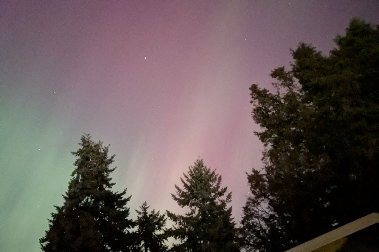 That’s what happened on Friday. “What’s the aurora forecast for tonight?” I asked a friend who keeps up with those things. “Amazing,” he said. He wasn’t lying. At 9:30PM, my husband and I went to the backyard to check the sky — nothing but hazy light pollution on the northern horizon. But just an hour later, the sky erupted.