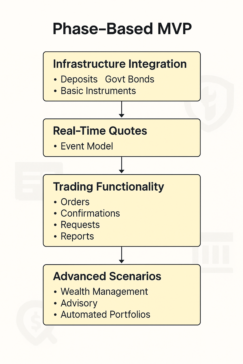 - Only later: advanced scenarios like discretionary portfolios, robo-advisory, recommendations.