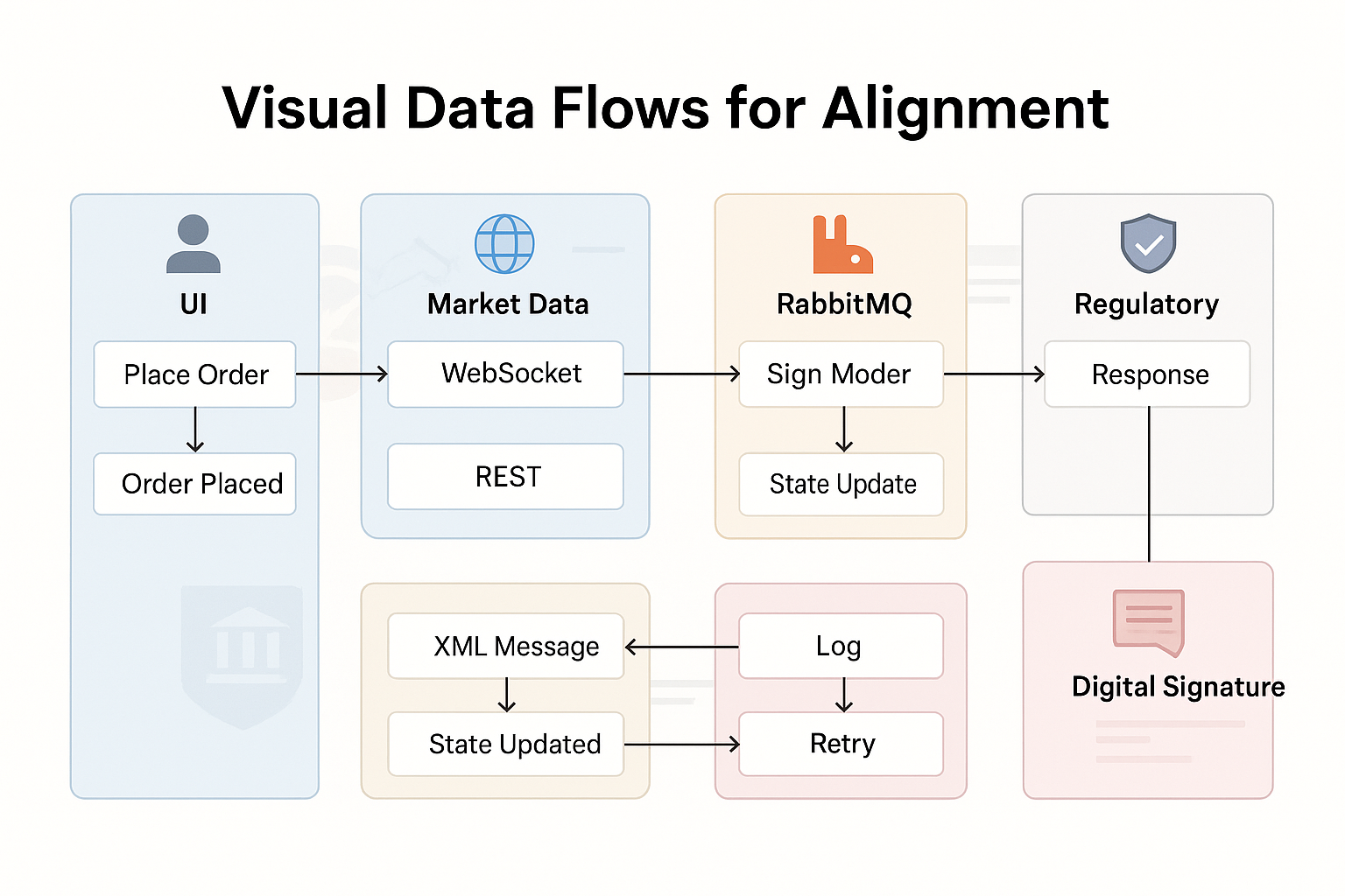 What works is a clear, end-to-end visual flow diagram showing the complete path — from UI events through internal systems, queues, signing, regulatory checkpoints, and external responses.