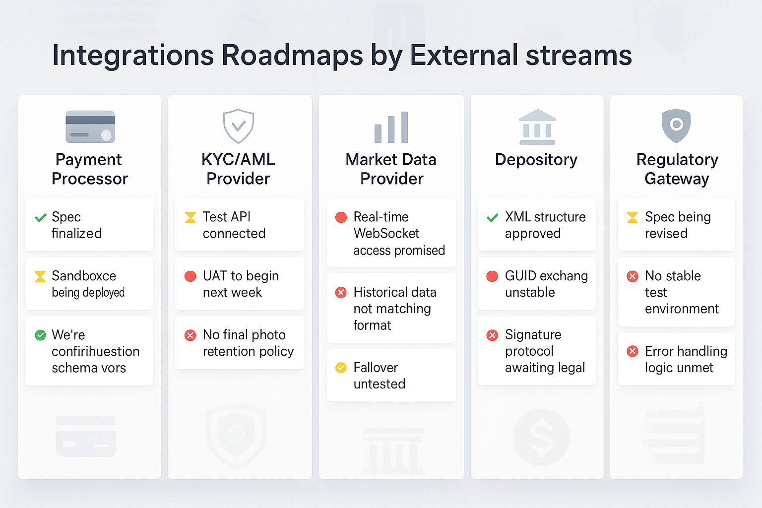 A single consolidated project plan for all external integrations may seem very convenient at first: everything in one place, easy to track. But in reality, it falls apart quickly. Every vendor moves at a different pace, with different SLAs, maturity, and communication levels. On the same board, you might have a fully prepared payment processor with a signed spec and delivery date — and a payment gateway that hasn’t even issued sandbox credentials.