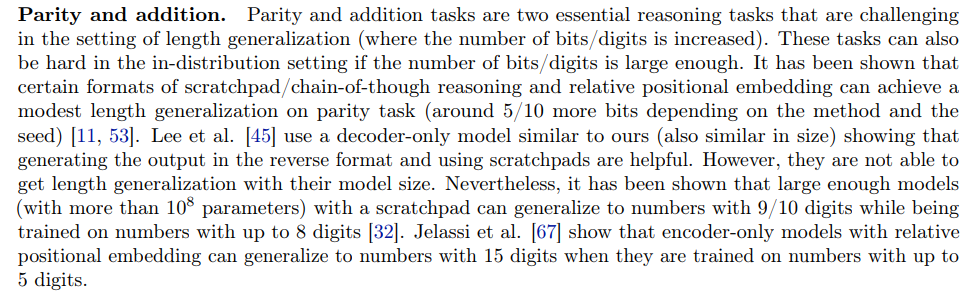 The RASP-L work [68] considers the addition task and can get length generalization from 35/40 to 50 digits (depending on the random seed) by outputting the result in the reverse order and also using ‘index hints’ which are special tokens that come before the operands’ digits in a specific order. For instance, an example would look like a5b4 + a3b7 = b1a9. Likewise, for parity targets, they use index hints along with scratchpad and can get length generalization from 30/35 bits to 50 bits (depending on the seed).