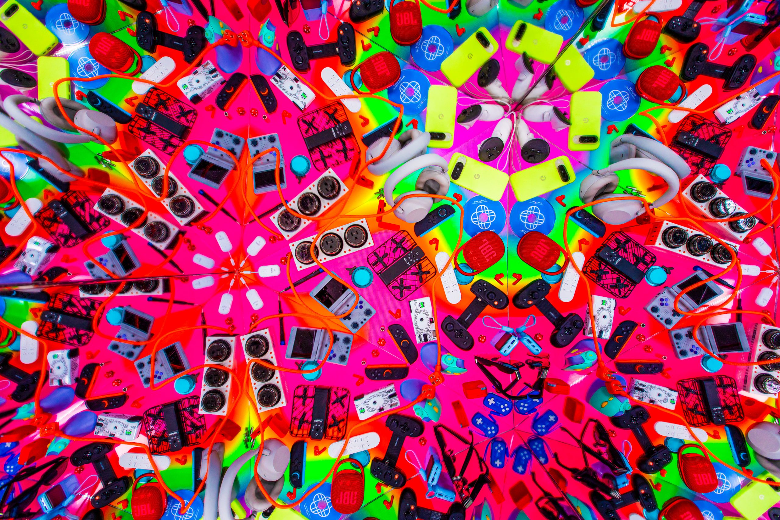 A kaleidoscopic image consisting of many tech products, including the Genki Moonbase, Backbone Pro, Pixel 10, arranged in a manner that creates the illusion that there are many more than there actually are.