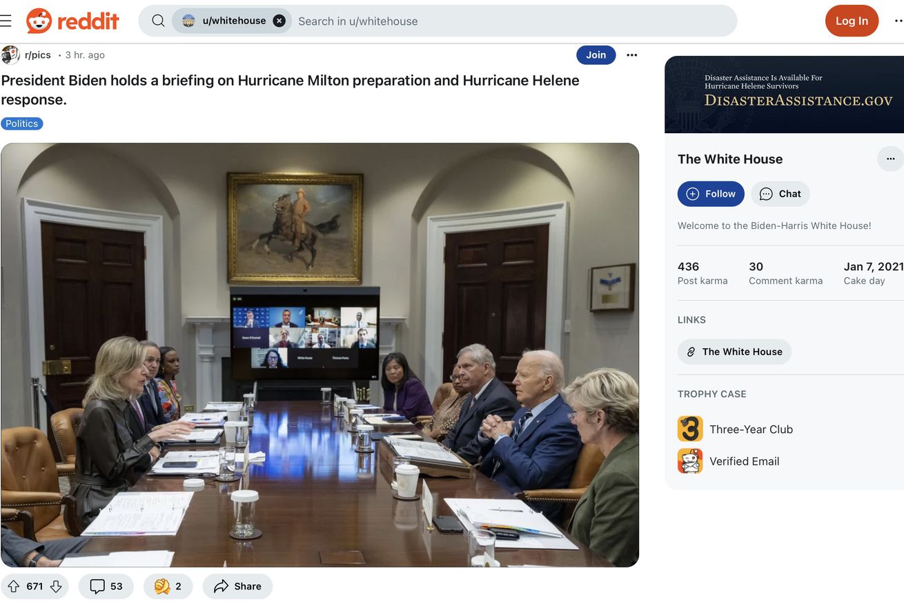 The White House started posting on Reddit to talk about Hurricane Milton