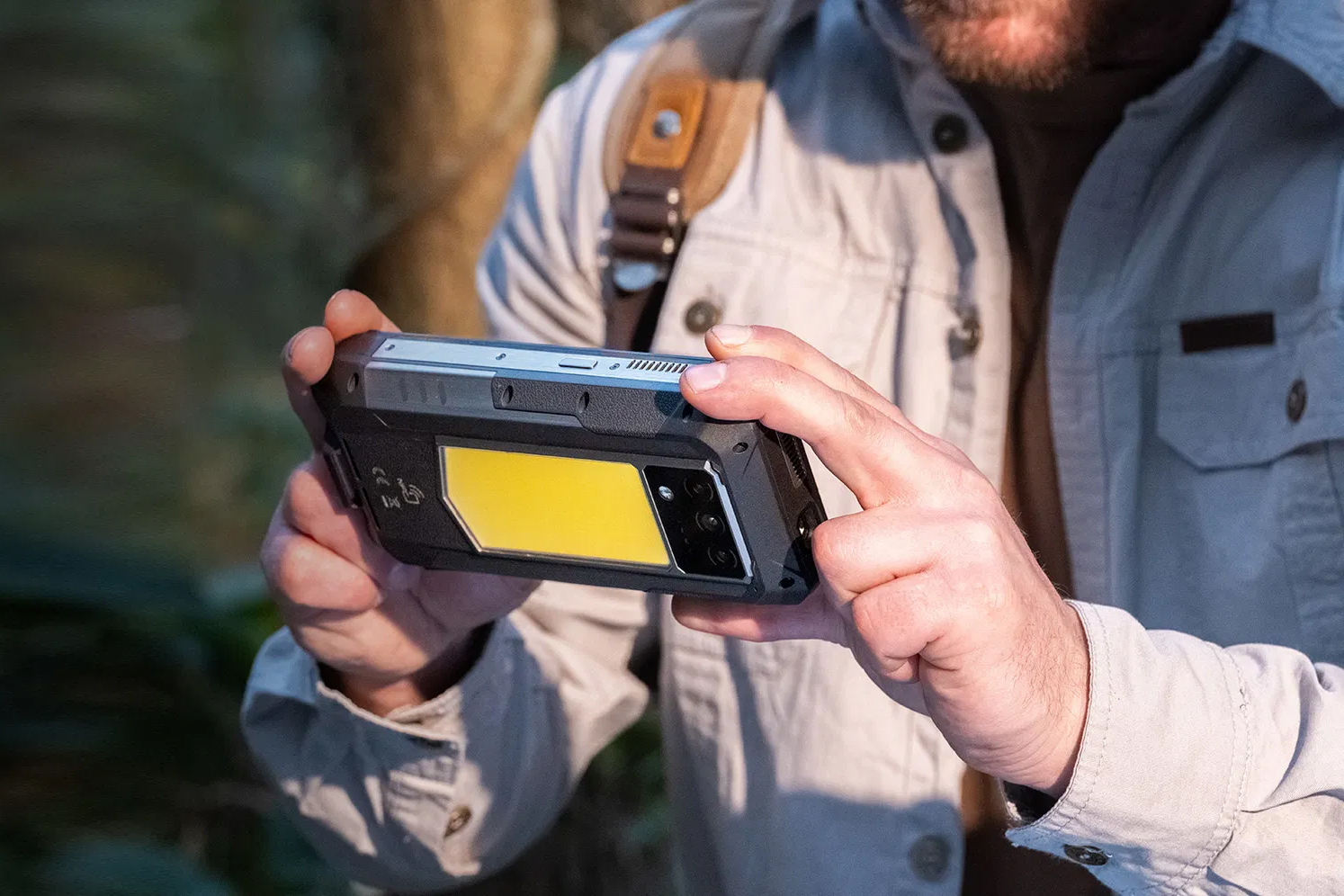 A person holding the Oukitel WP100 Titan smartphone in two hands while using it outdoors.