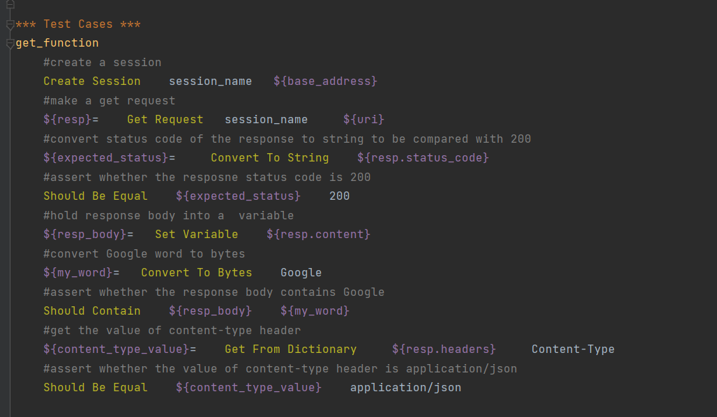 To test a simple Get request, we should import “RequestsLibrary” in settings because we want to make a request. In test cases, first, we should define a keyword for our test scenario, and then we should write the test steps in the keyword’s scope. See the picture below: