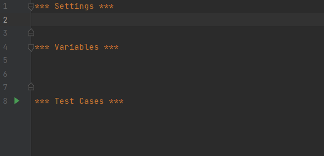 Each .robot file usually contains three main parts: Settings, Variables, and Test cases like the below image.