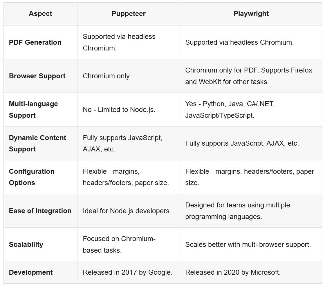 Both Puppeteer and Playwright are powerful tools for PDF generation, leveraging the same Chromium engine. The choice between the two largely depends on your specific needs, such as your preferred programming language, the complexity of your project, and whether you need to automate multiple browsers beyond PDF generation.