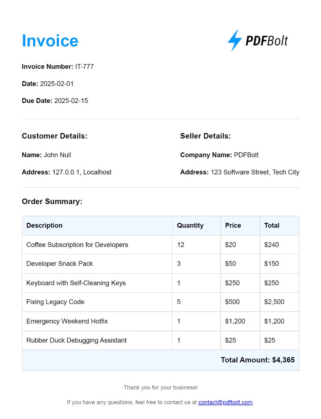 Don’t want to manage browser instances yourself? If you’re looking for a simpler route, you could opt for an API-based solution such as PDFBolt — an approach that offloads the maintenance and scaling concerns, letting you focus on your core application logic.