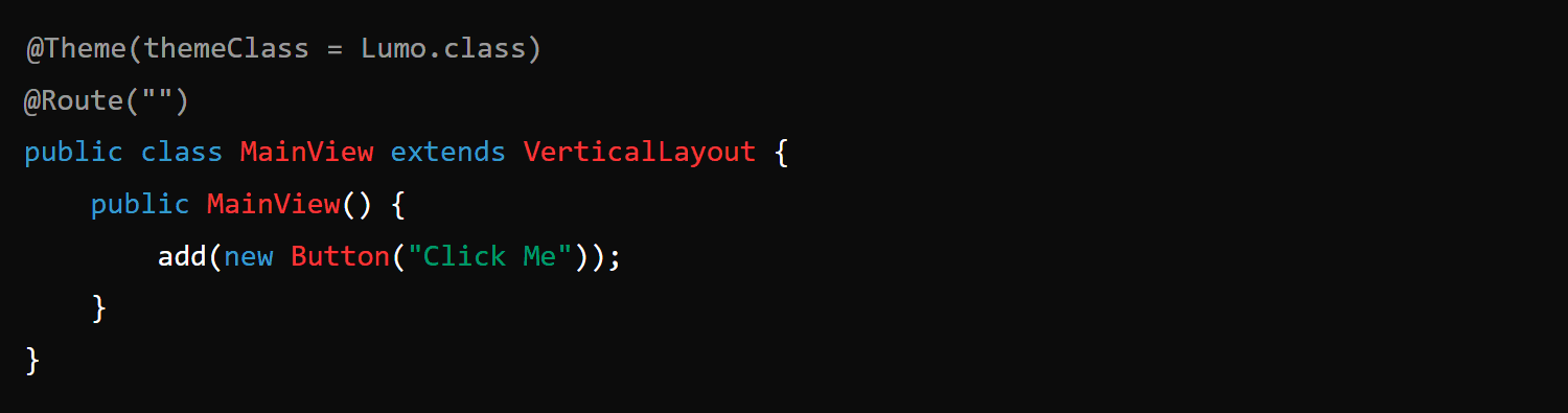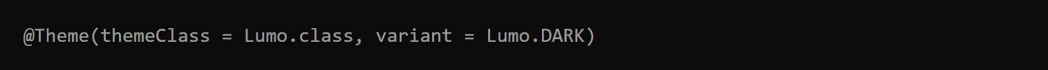 The @Theme annotation is used to specify the theme for a Vaadin application. By default, if no theme is set, the application uses Lumo. However, we can explicitly declare it: