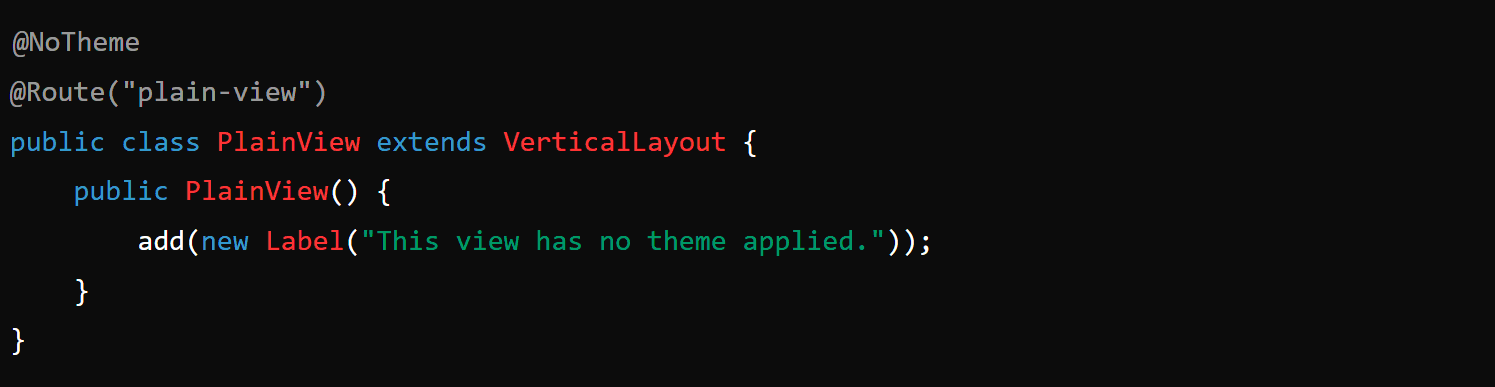 Sometimes, a specific view might need to be rendered without any theme, even the default Lumo theme. This is where @NoTheme comes into play: