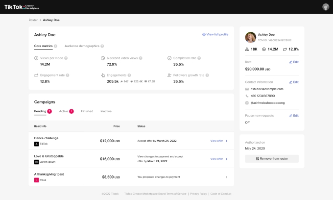 TikTok is making it easier for brands to work with its “megastar” creators with an update to its Creator Marketplace that now invites talent managers to oversee, execute and analyze the brand opportunities and campaigns being presented to their clients. This week, the video entertainment platform introduced a new Talent Manager Portal as a part of the TikTok Creator Marketplace — its platform that allows brands and agencies to connect with 800,000 qualified creators around the world.