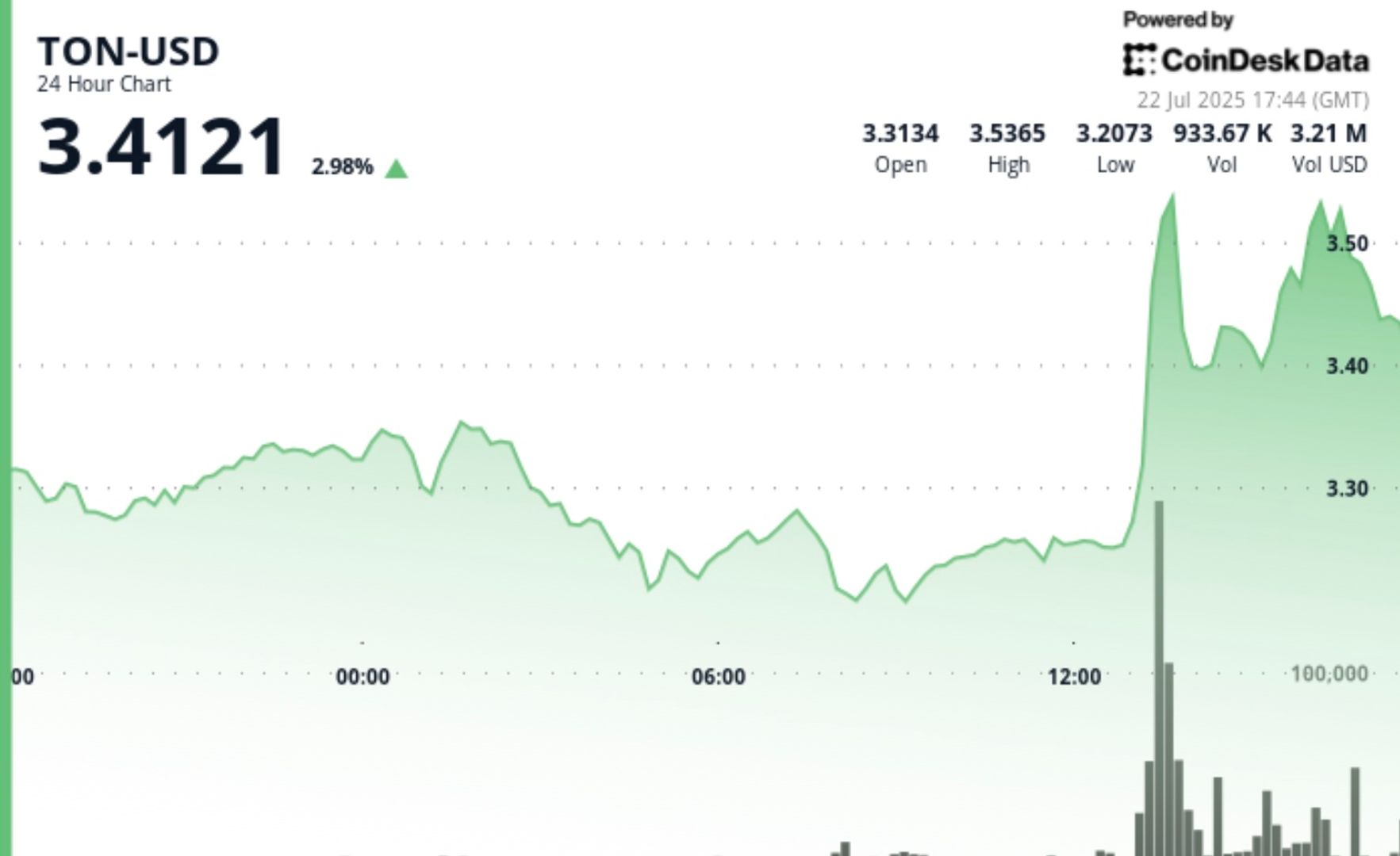 • According to CoinDesk Research’s technical analysis data., TON rallied strongly during the 23-hour trading window from July 21 18:00 UTC to July 22 17:00 UTC, climbing from $3.25 to $3.58 and delivering a 10.15% intraday surge at 13:00 UTC on July 22, supported by 46.32 million units of trading volume