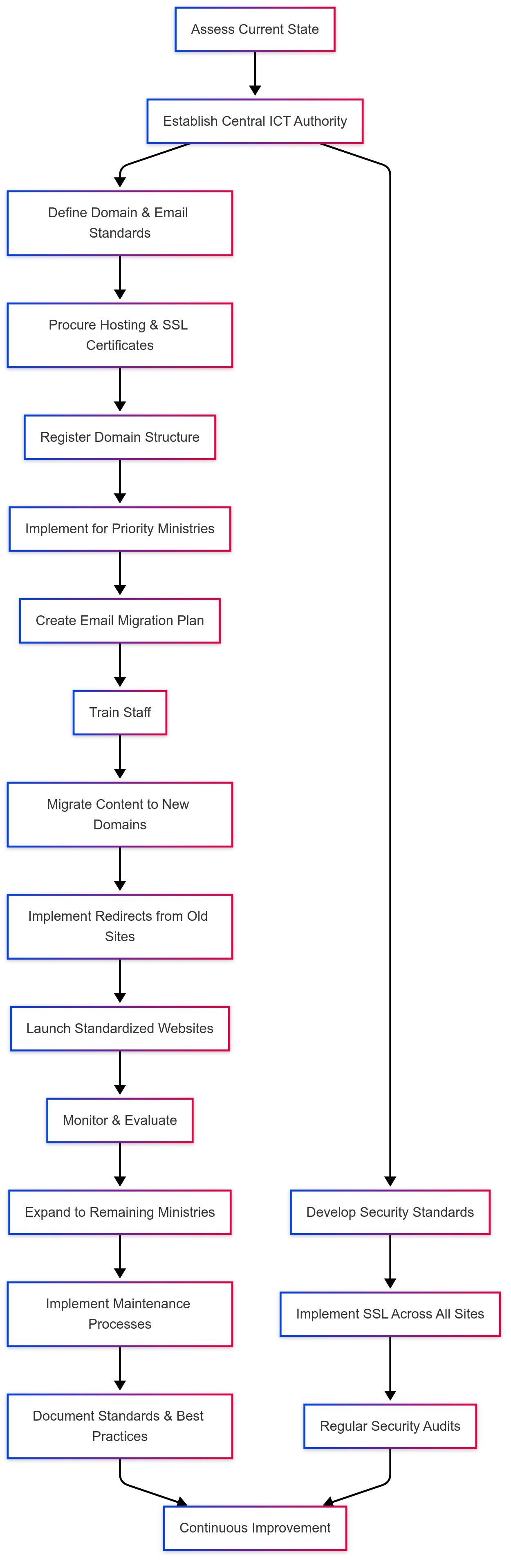 Establish a central ICT authority with the mandate to enforce standards across all ministries, providing technical support and ensuring consistency.